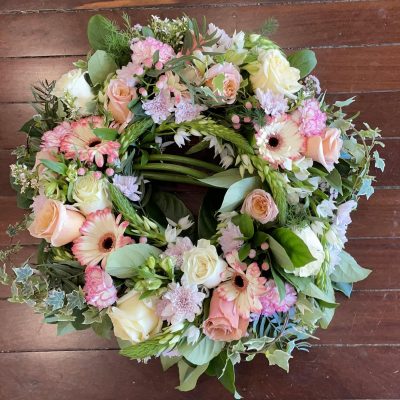A subtle blend of white and yellow flowers in a cane basket with handle